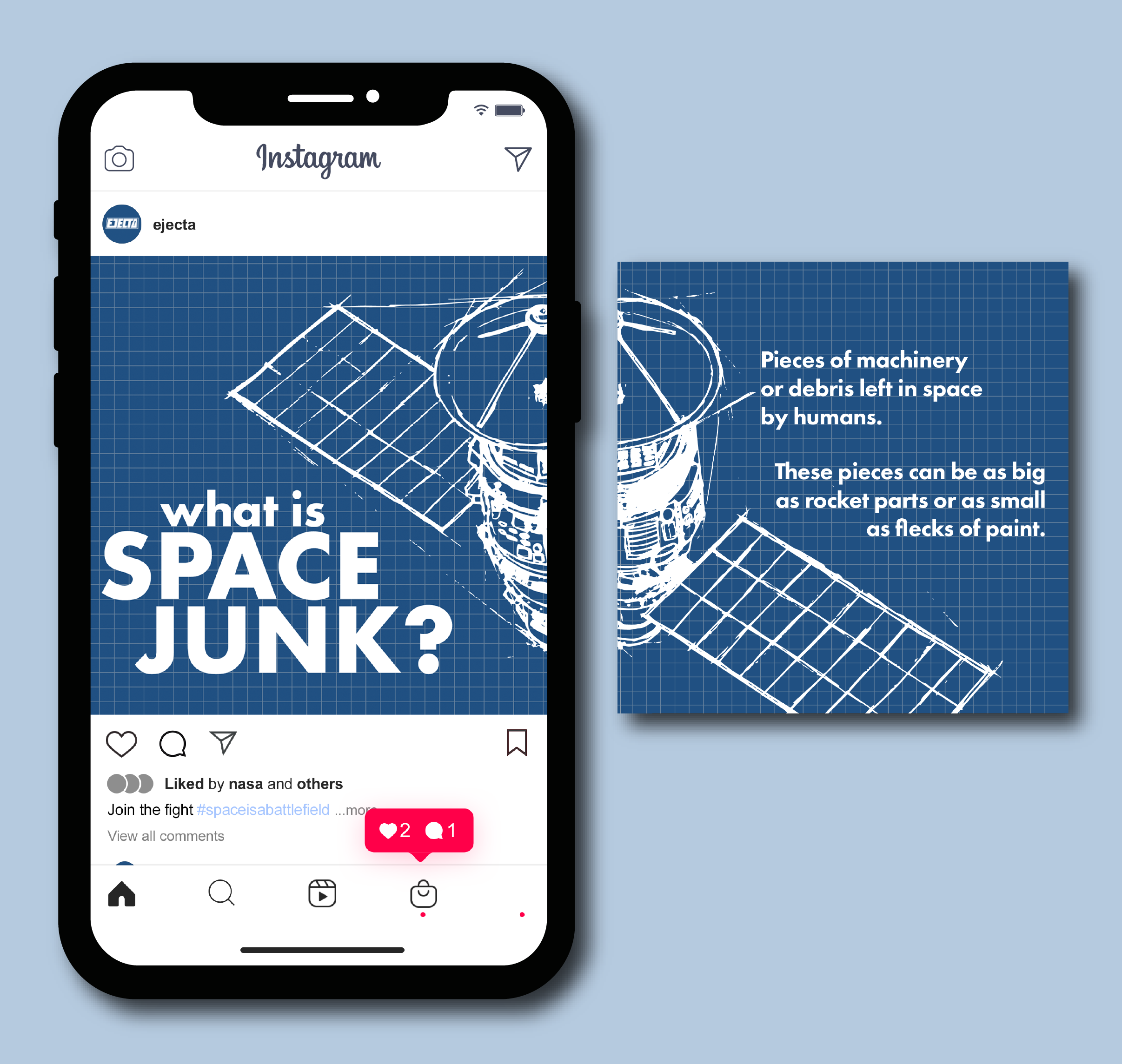 EJECTA is a campaign designed to bring awareness to the unknown problem of space trash. The danger of space trash is caused by various debris leftover from space exploration that when they collide can cause catastrophic chain reactions. The campaign features a series of posters,