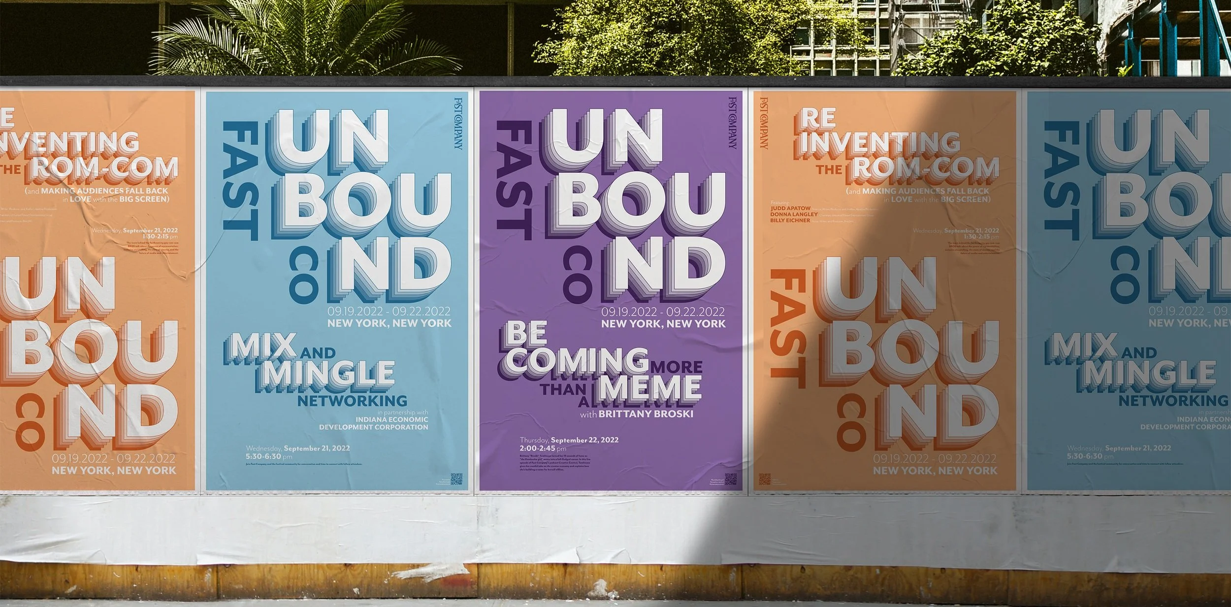 Design assets for the 2022 Fast Company Innovation Festival, "Innovation Unbound." The main visual component shows the word unbound broken apart to highlight the theme of the conference of breaking boundaries. This visual representation of the theme is repeated in various ways throughout the rest of the branding for the conference.
